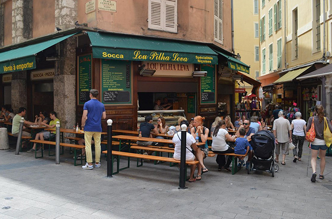Service au comptoir pour socca, pissaladière ou beignets à consommer sur de longues tables en terrasse.